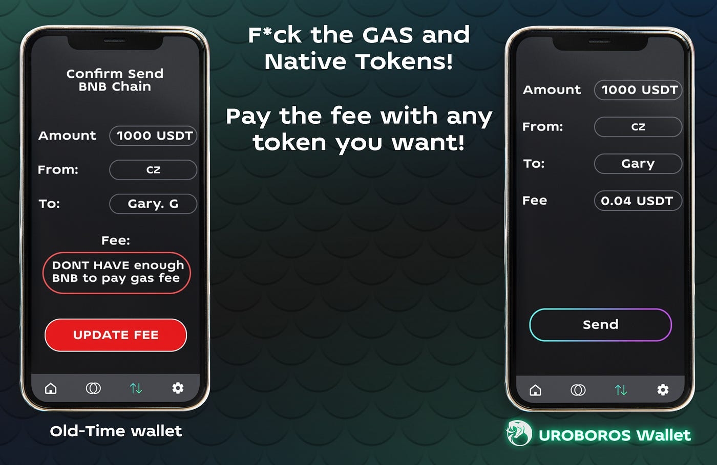 With Uroboros wallet, you can trade, earn, store, and send crypto assets between blockchains without paying the gas fee or buying native tokens.