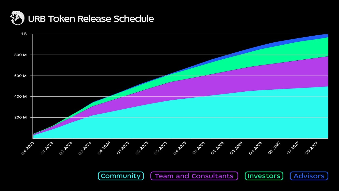 A total of 1 billion URB tokens will be minted and made accessible to the public over a period of 4 years. The tokens will be distributed in a carefully planned order to ensure a sustainable pace of release and long-term growth and adoption of the URB platform. The distribution will take place as follows: